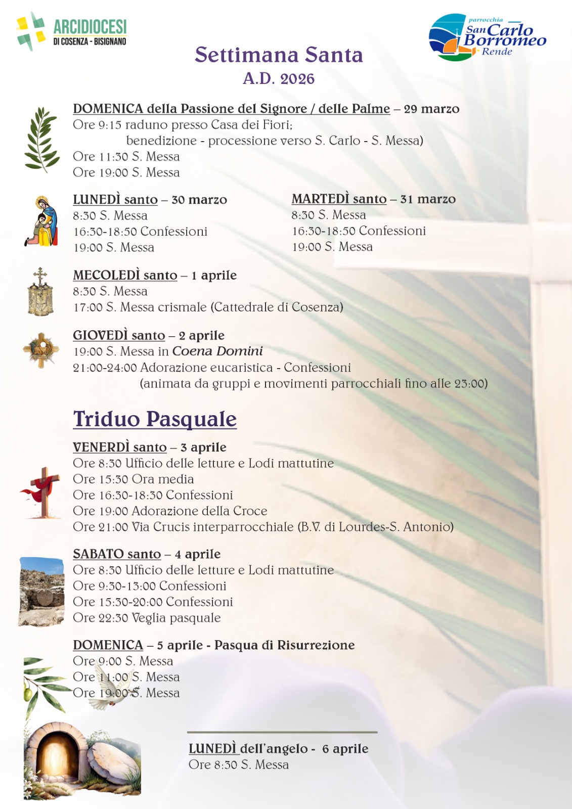 Domenica 29 marzo – Domenica delle Palme – inizieremo la processione da Casa dei Fiori alle ore 9:30 (raduno ore 9:15) e a seguire la Santa Messa. Le altre S. Messe saranno celebrate alle ore 11:30 e alle ore 19:00(CAMBIO DELL’ORA) AD OGNI CELEBRAZIONE SI BENEDIRANNO I RAMI!.