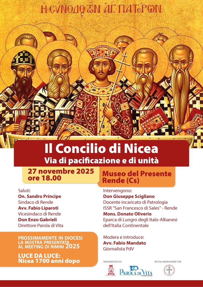 Giovedì 27 novembre S. Messa delle ore 8:30 a S. Maria di Monserrato; dopo la S. Messa delle 18:00 a S. Carlo adorazione eucaristica; alle ore 18:00 presso il Museo del presente conferenza sui 1700 del Concilio di Nicea… interverranno Mons. Donato Oliverio – Eparca di Lungro – e D. Enzo Gabrieli – Direttore di Parola di vita e parroco presso la S. Famiglia di Castrolibero.