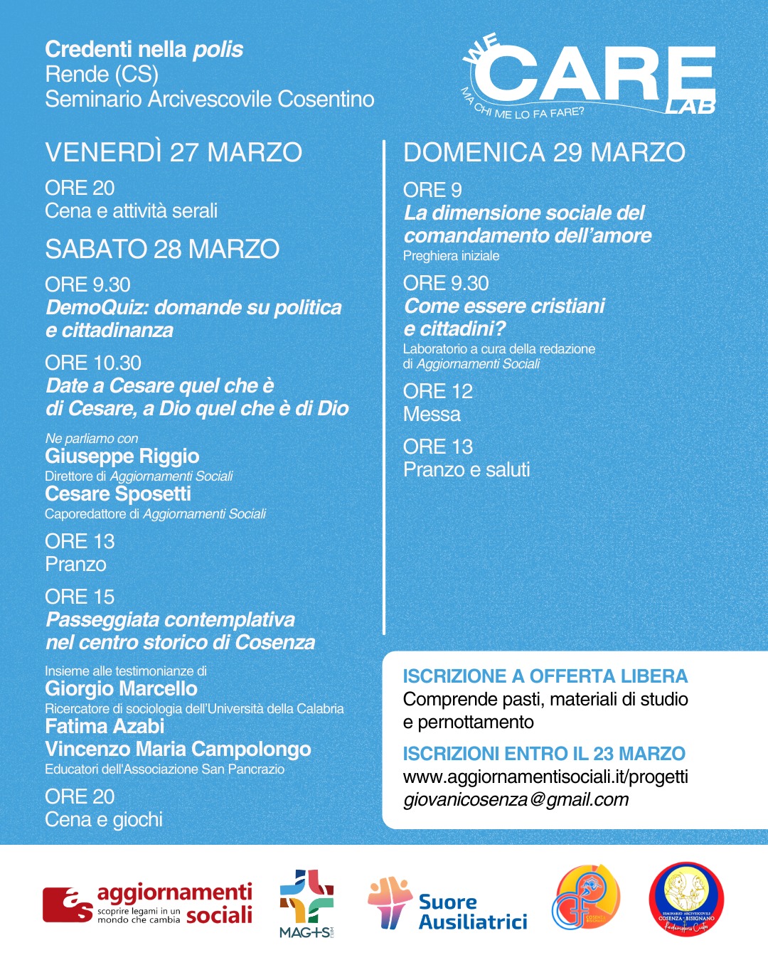 Per i giovani adulti fino ai 35 anni la Diocesi propone un laboratorio di formazione alla vita sociale e politica We care lab. Ma chi me lo fa fare? Per dettagli e informazioni si può consultare la locandina seguente.